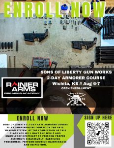 We will also host our friends from Sons of Liberty Gunworks to offer their armorers course. On August 6-7, they will be here to impart their knowledge and experience to our customers. They will teach an all-encompassing armorer’s course centered around the AR platform.