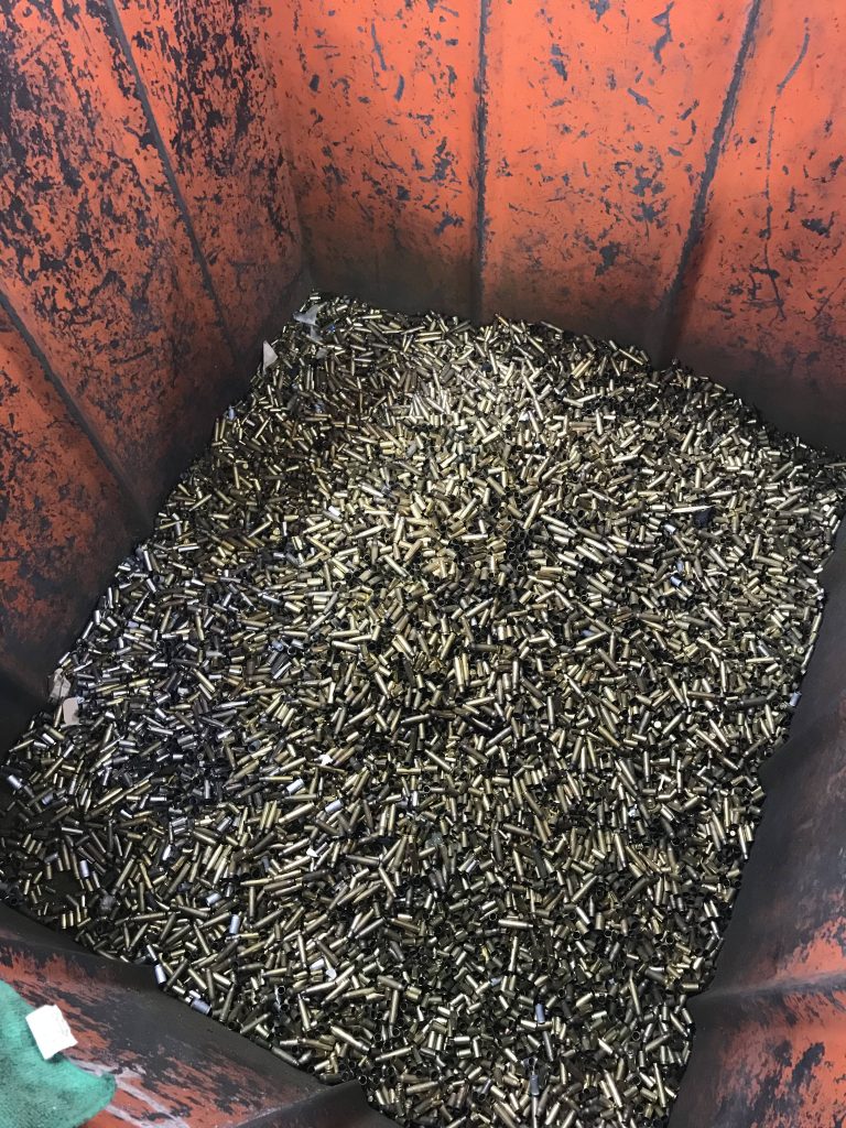They clean the range’s floors and fix the rubber pile that catches the projectiles. This is the first step of our sorting process. Range staff are equipped with a sweet set up I wish I had in the army! I call it, The Police Caller 9000. First there’s a magnet that pulls all the gross steel we don’t want. They will also do they’re best to remove as much aluminum or any other weirdness we don’t want. Then a rolling device with rubber fingers is pushed across the ground. The fingers sorta grab casings and dump them into a basket.